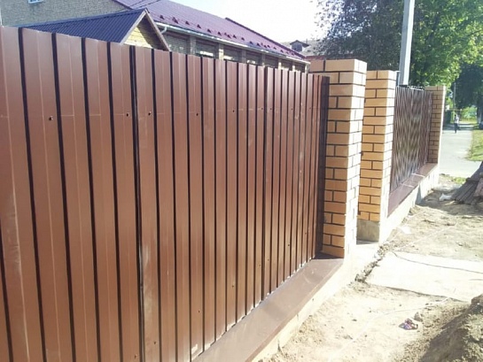ЗАБОР ИЗ ПРОФНАСТИЛА С КИРПИЧНЫМИ СТОЛБАМИ 6 СОТОК